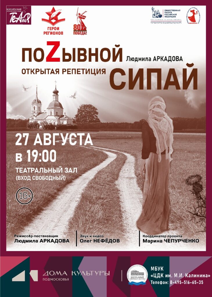 Во Дворце культуры «Россия» г. Серпухов состоялся показ музыкального документального спектакля «ПоZывной «Сипай». Эта постановка рассказывает о судьбе участника специальной военной операции Александра Платайса, героически погибшего в 2022 году. Это документальная пьеса о стойкости, всепобеждающей силе любви и глубокой вере. На этом зиждется великая духовная сила русского народа. Автор пьесы, режиссер-постановщик: Людмила Юрьевна Аркадова Звук и видео: Олег Нефёдов